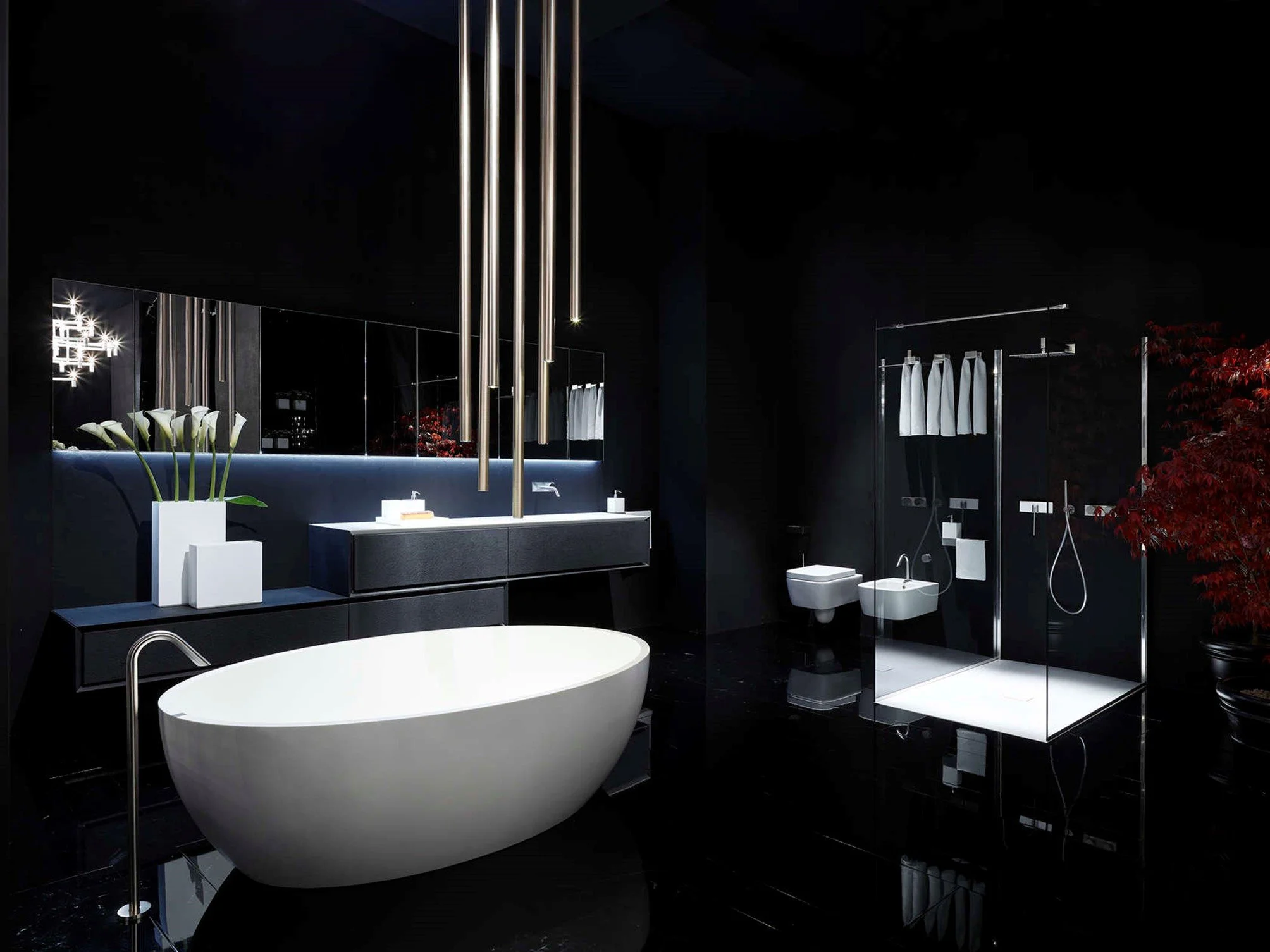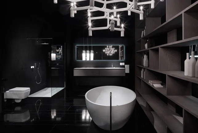 La finition en béton noir, spatulé à la main, est la vedette de cette proposition. On la retrouve sur le meuble K.ONE ainsi que sur la baignoire Smooth 1. Le miroir est rétroéclairé par LED, et les accessoires de salle de bains sont de la collection CLEAN en acier, y compris les porte-serviettes suspendus au plafond. Le receveur de douche et le miroir SPECCHI-ONE en acier avec rétroéclairage LED complètent la collection.