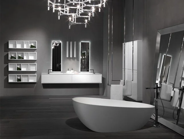 Une salle de bains moderne et élégante, caractérisée par la collection K.ONE en pierre de lave. Le meuble est associé à un lavabo intégré dans le plan en solid surface avec une bonde continue, des accessoires de la collection Clean en acier et solid surface, et des robinets modèle Wave en acier satiné. Le miroir de rangement est rétroéclairé par LED, tandis que la baignoire autoportante fait partie de la collection Oval. Les sanitaires suspendus modèle Thin et le receveur de douche à fleur de sol complètent la composition, ainsi que les lampes de plafond de la collection Tubes.