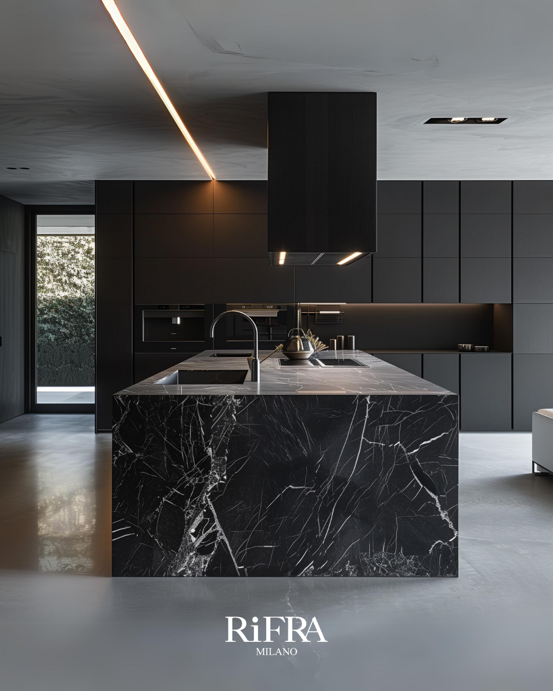 Cuisines RiFRA : Élégantes et avant-gardistes, nos cuisines sont le cœur de la maison moderne. Avec des surfaces en marbre noir qui se fondent avec des armoires linéaires et sophistiquées, elles sont conçues pour ceux qui aiment se distinguer et apprécier la beauté au quotidien.