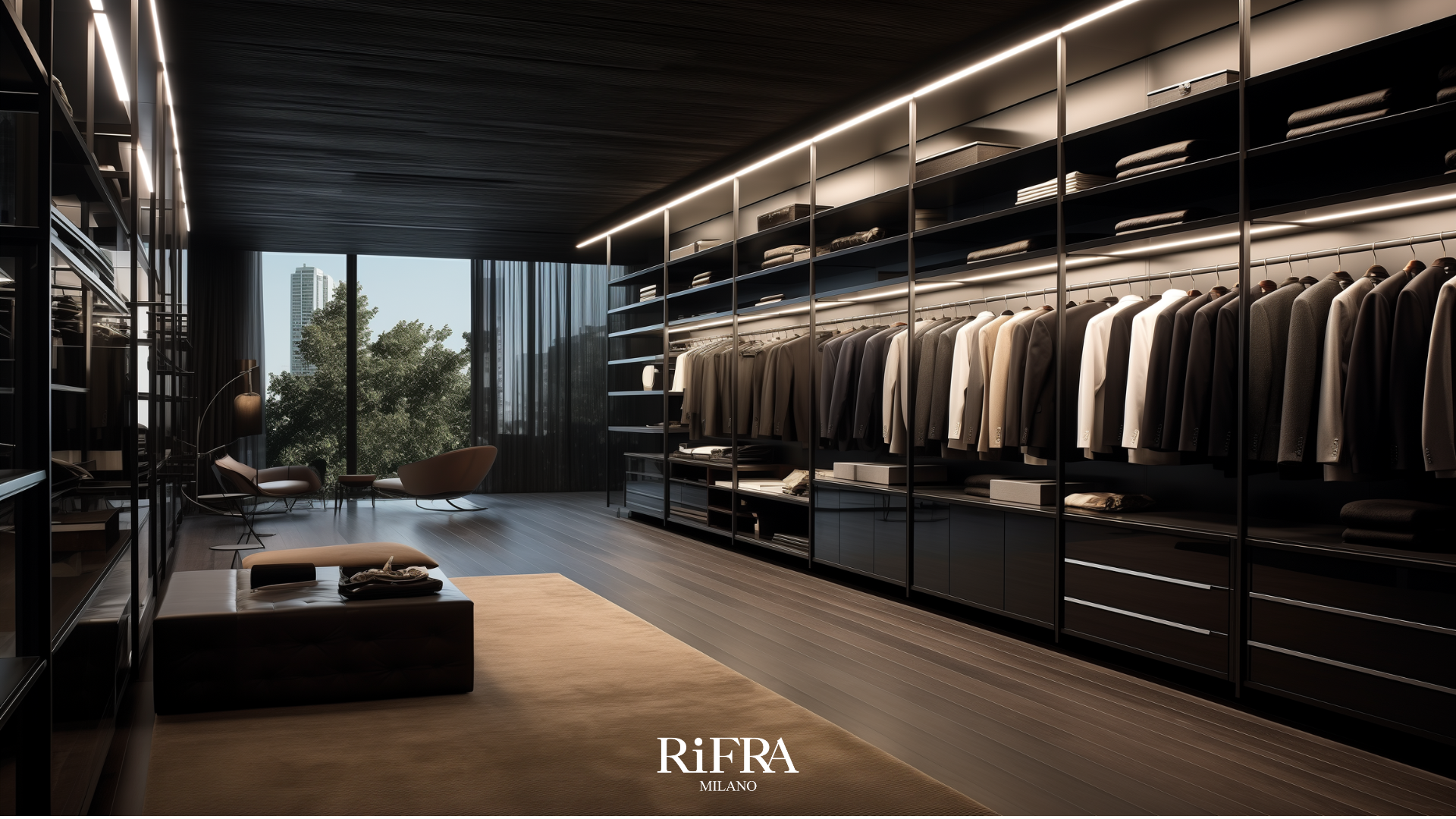 Conçu pour les amateurs d'ordre et de mode, le dressing RiFRA est l'emblème de la personnalisation et du luxe, un lieu où chaque vêtement trouve sa place parfaite.