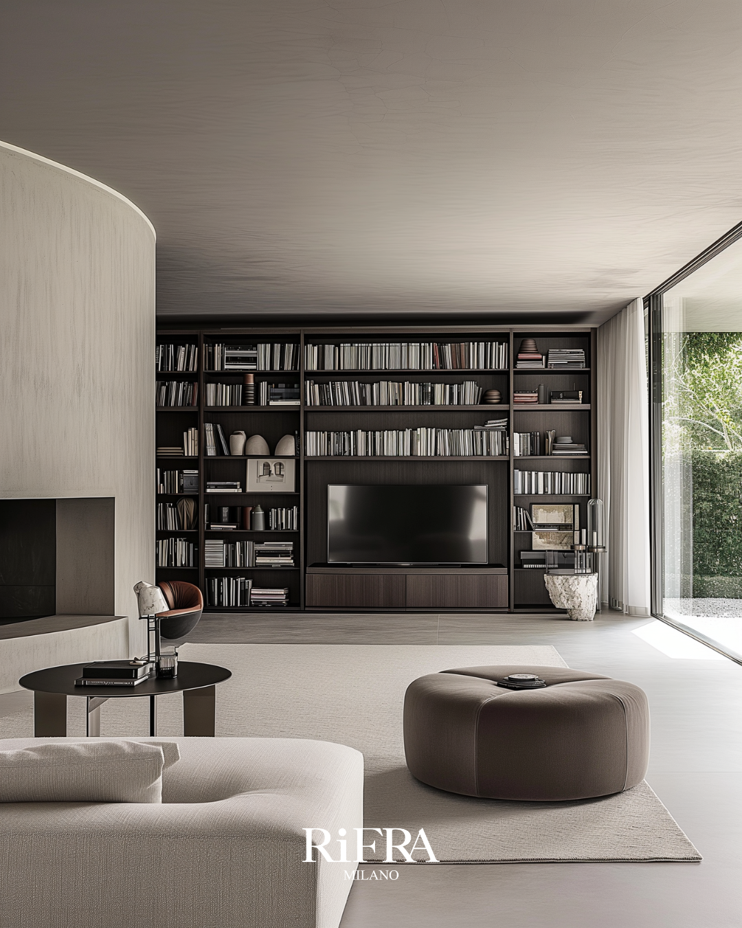 Enfin, le salon avec bibliothèque est l'endroit où votre amour pour les livres rencontre le design innovant. Des étagères élégantes se combinent avec un espace de vie confortable et sophistiqué, offrant une vue incomparable sur l'extérieur qui se fond avec l'intérieur.