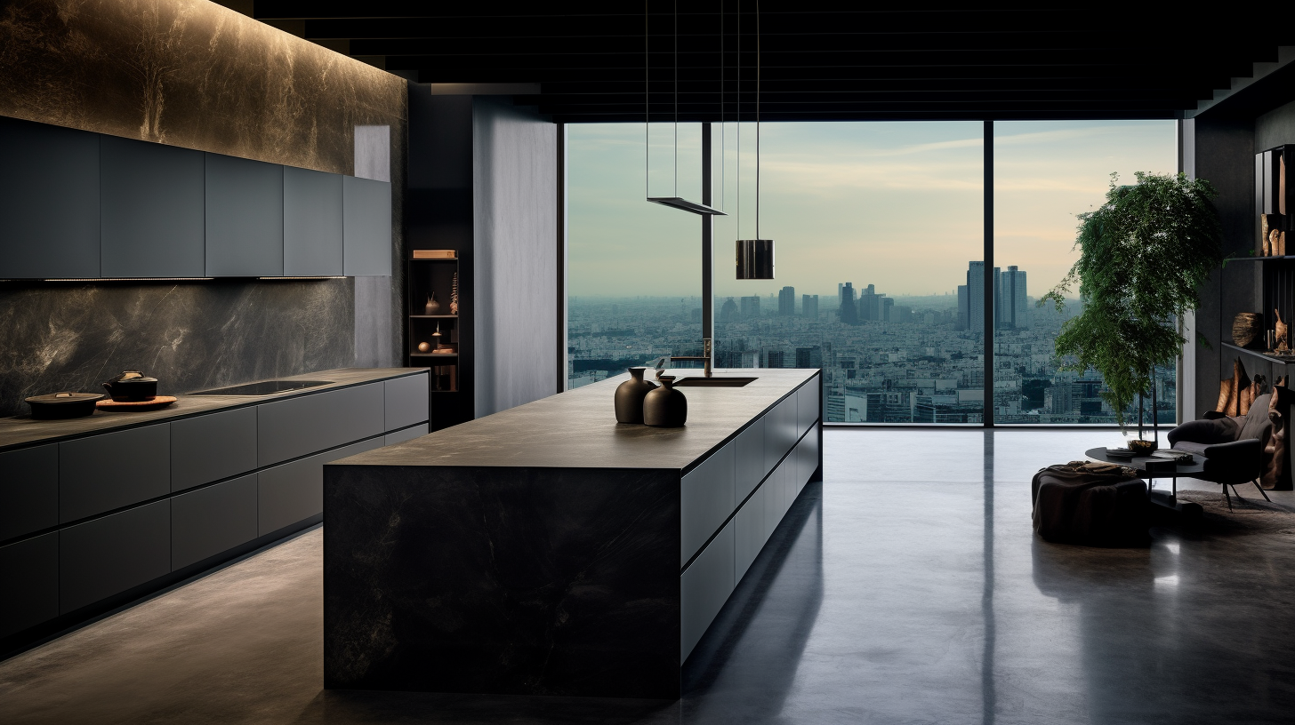 La cuisine, avec son design novateur, met en avant une île majestueuse en béton noir. C'est le centre névralgique autour duquel la vie quotidienne s'articule. Complétée par un sol en béton gris clair, elle offre un cadre sophistiqué, prêt à accueillir chaque exploration culinaire