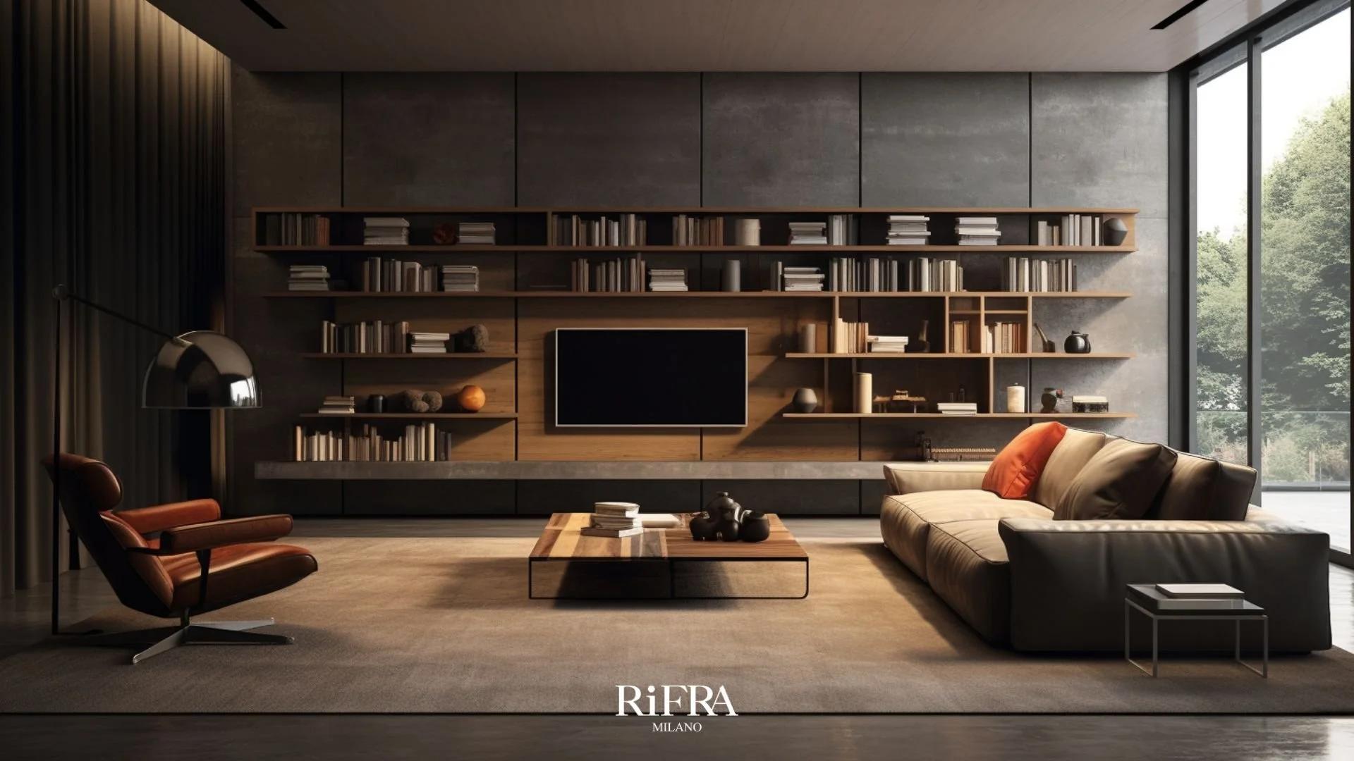 Le salon RiFRA est conçu pour être le cœur de la maison, un espace accueillant et sophistiqué, où chaque élément, du meuble TV aux bibliothèques, est conçu non seulement pour le confort mais aussi pour une esthétique de haut profil.
