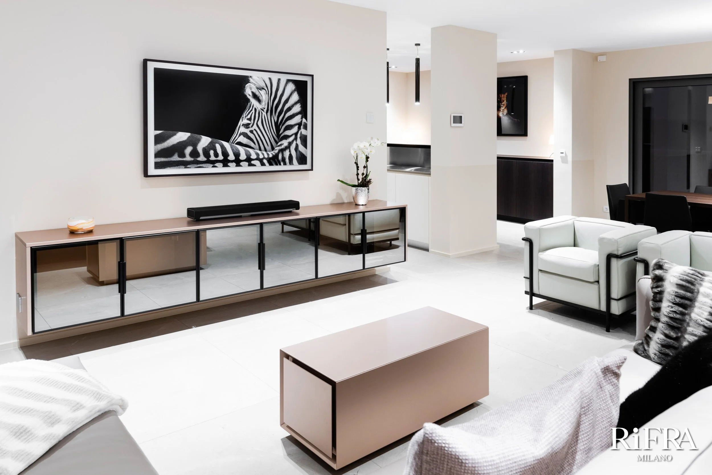Meubles-TV, meubles avec bibliothèques intégrées, buffets, boiserie, étagères sont quelques-unes des propositions RiFRA sur mesure pour la zone jour, qui sont conçues en écoutant les souhaits du client et en uniformisant le style du séjour au reste de la « Maison RiFRA ».