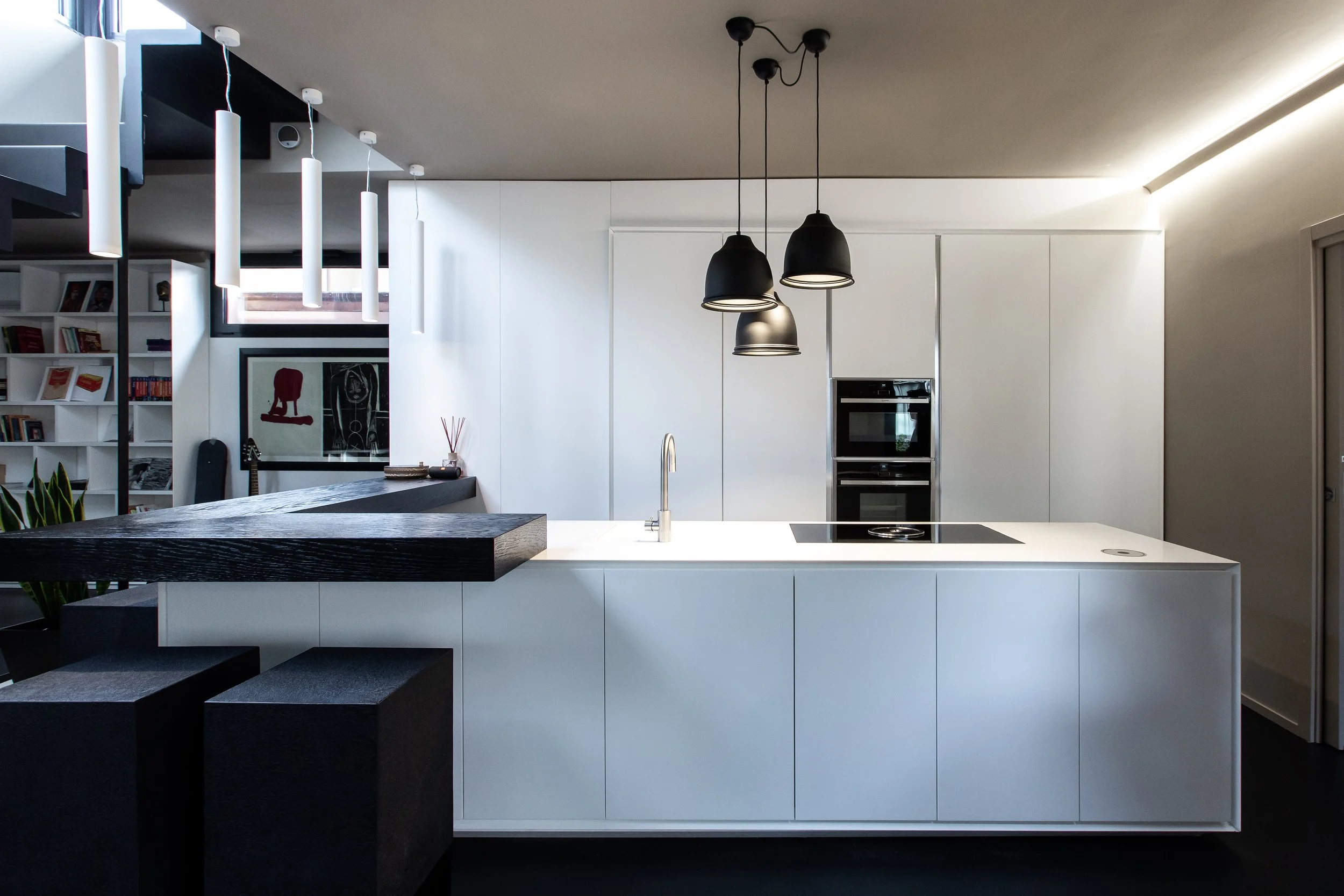 Cuisine ONE avec îlot laqué noir mat et meubles bas et colonnes laqués blanc pur mat.